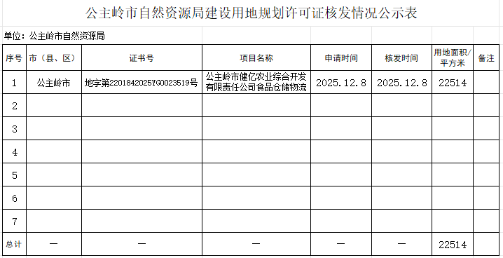 公主岭市自然资源局建设用地规划许可证核发情况公示表(2025.12.8)