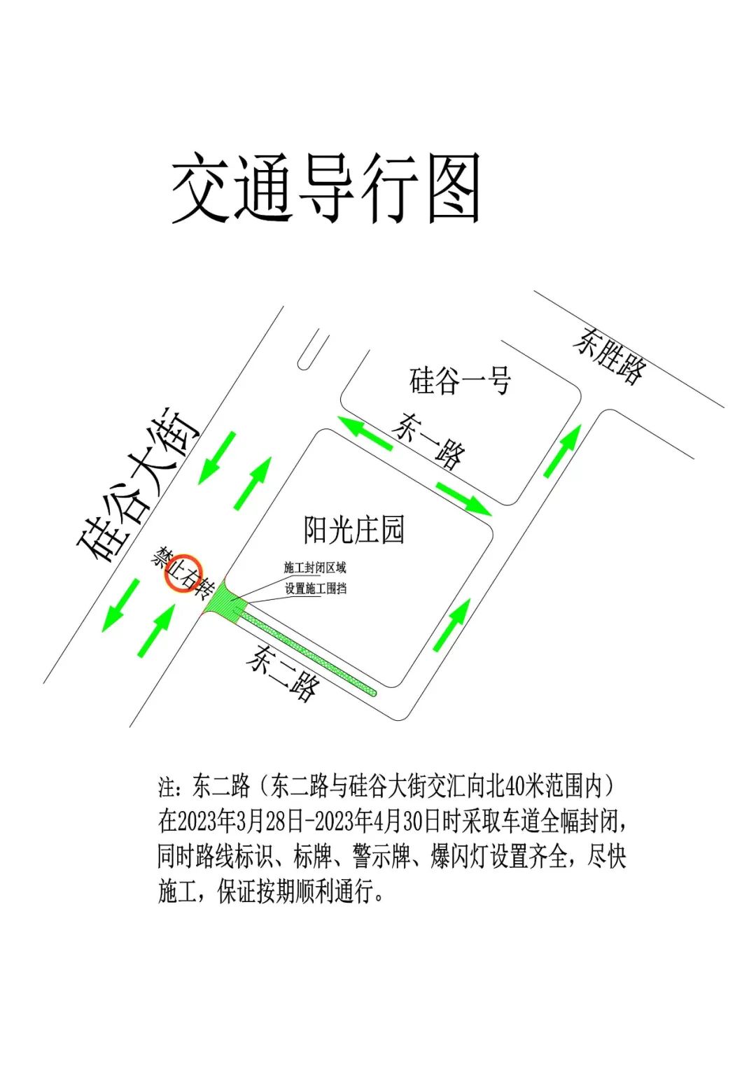 为了保证2023年公主岭市范家屯镇硅谷大街(东一路-杨柳河)道路扩建工程的安全、顺利实施,对东二路(东二路与硅谷大街交汇东二路向北40米范围内)实行全幅封闭施工,封闭情况如下: