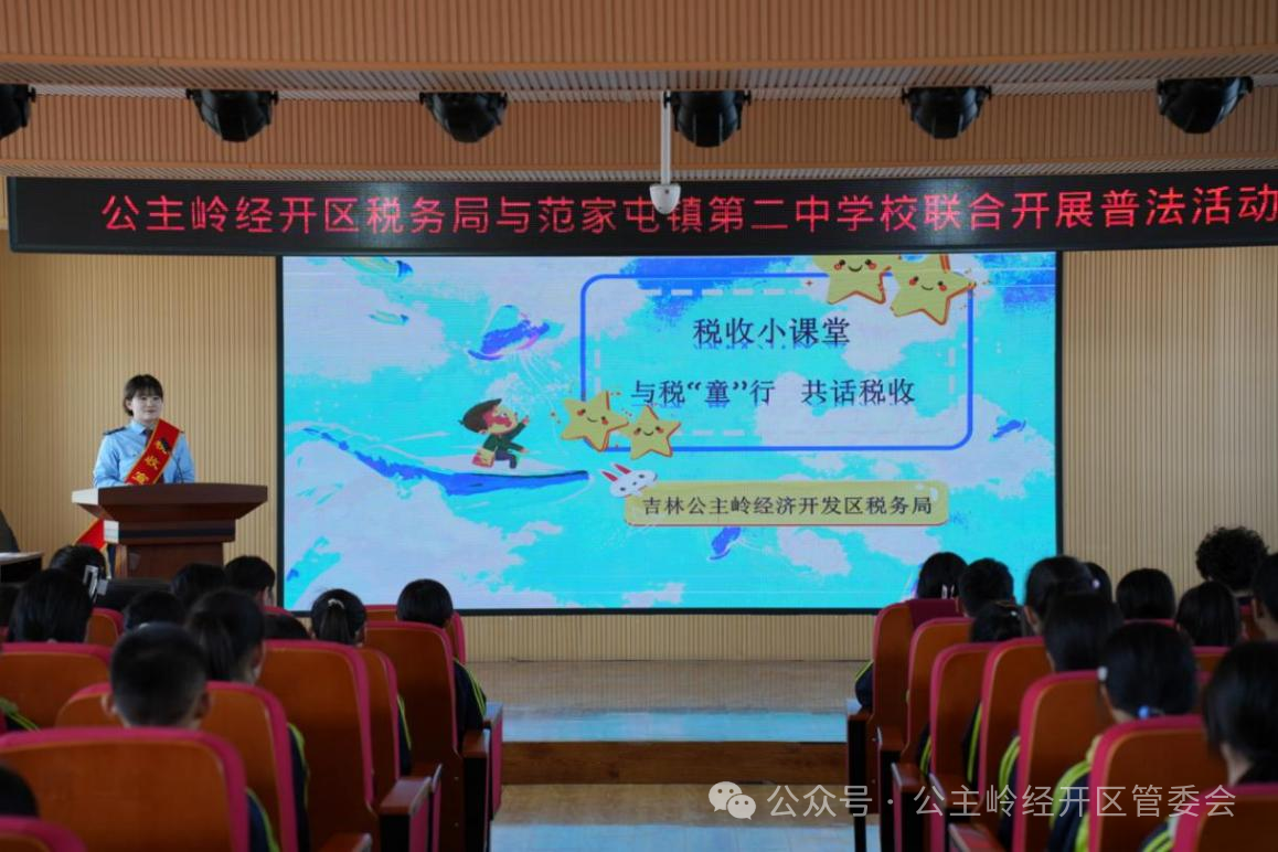 在公主岭市范家屯镇第二中学校,吉林公主岭经开区税务局宣讲团队走进课堂,为学生们上了一节生动精彩的“税收小课堂”。