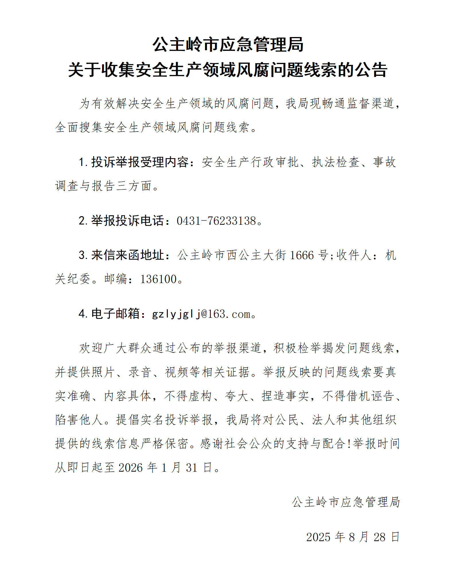 公主岭市应急管理局 关于收集安全生产领域风腐问题线索的公告