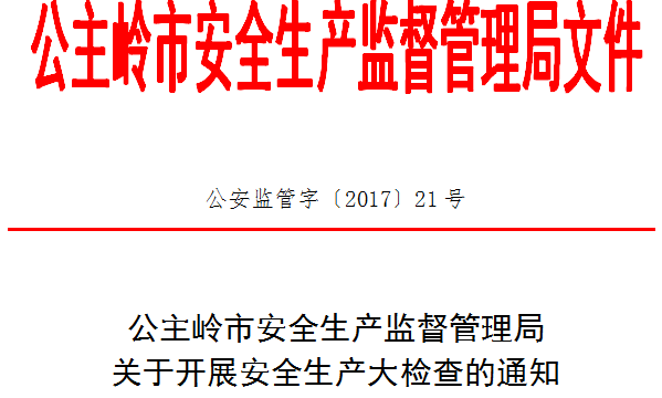 按照《公主岭市安全生产委员会关于开展全市安全生产大检查的通知》(公安委字[2017]19号)要求,开展一次彻底的安全生产大检查,全面排查治理安全生产隐患,堵塞安全监管漏洞,强化安全生产措施,打击非法违法和违规违章生产经营行为,做到“全覆盖、零容忍、严执法、重实效”,有效防范和坚决遏制安全事故发生。