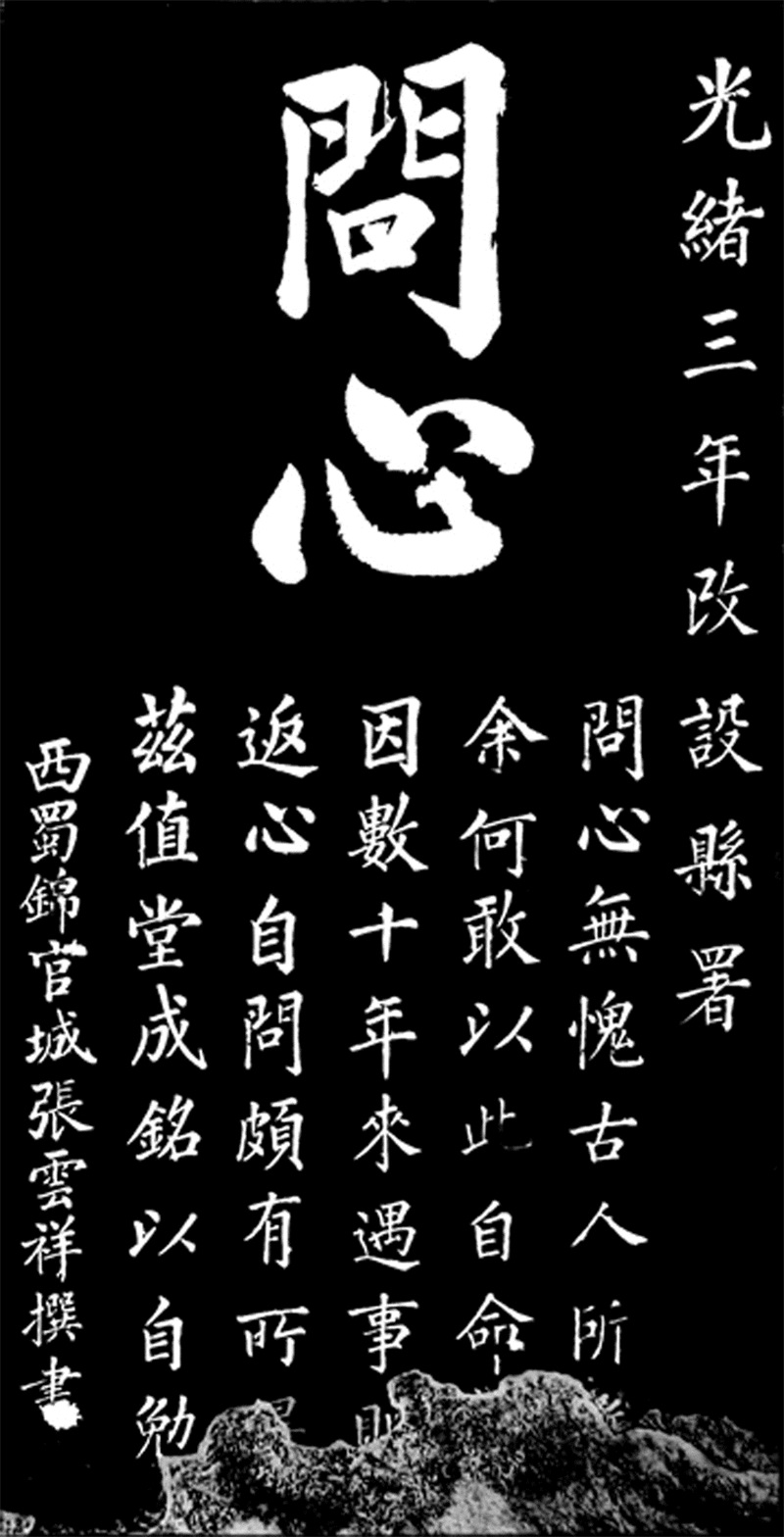 张云祥知道此事后,亲自登门去庙上送钱,哑巴水头还是摆手不收。询问原委,哑巴水头让管事僧人拿出了他求写的答帖,上面写着14个大字:设县为民民感恩,草民出力表寸心。张云祥看罢大受感动,对着哑巴水头一躬到底,长揖致谢。感动之余他做出一个决定,将这82文水费加入本街公议会的捐款数额中。刻碑时,师爷提醒:贰文钱零头太小,这么上碑好像不太好,能否记个整数?张云祥不许。他认为:捌拾贰文是百姓的一种情怀,如实记录的道理,就是要让世人明白,贰文零头虽小,体现的却是民情大义!只有真正悟到这种心境,才能真正做到“返心自问”为官为民。张云祥嘱令下属:贰文钱不减,据实镌刻上碑。