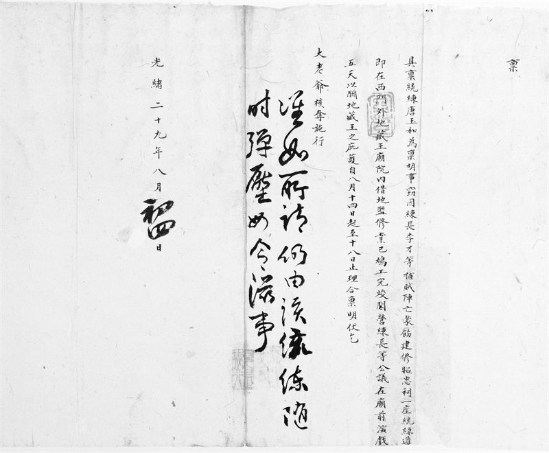 二是唐玉和任统练时,于光绪二十九年(1903年),为解决捕盗营战死官兵善后安恤事宜而提请县署募捐修建“昭忠祠”的全部文本档案,及新近出土的疑似“昭忠祠”石门联。这一批珍贵文档资料及实物的发现,对研究怀德“问心精神”的传承与接续,有着极其重要的意义。