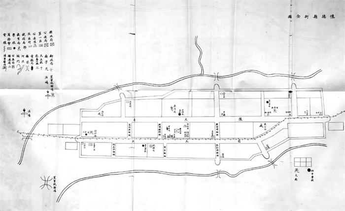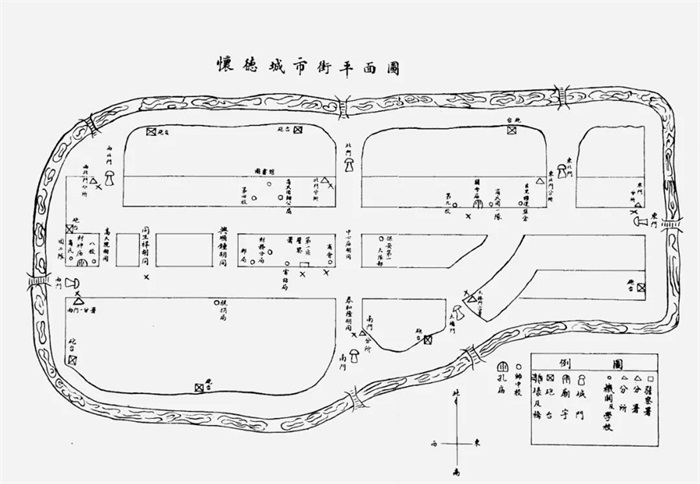 怀德老城前身为八家子,曾筑有土城,绕城南北各有一河。张云祥到任的第二年,既光绪四年(1878年)春,将原有土城改成砖筑城垣,城外挖沟,引南北二河蓄水,水深二丈,曰护城河。新城同时开设六座城门,命南门为归昌门,北门为保太门,东门为抚近门,东北门为绥远门,西门为通恩门,西北门为靖安门。一年后,因文庙建于城外东南,为此特增设一桥,增开一门,名“大桥门”。新城内扩建有前大街、后大街两条街路。史料载:两条街路均南北宽8丈,东西长5里(华里)。
