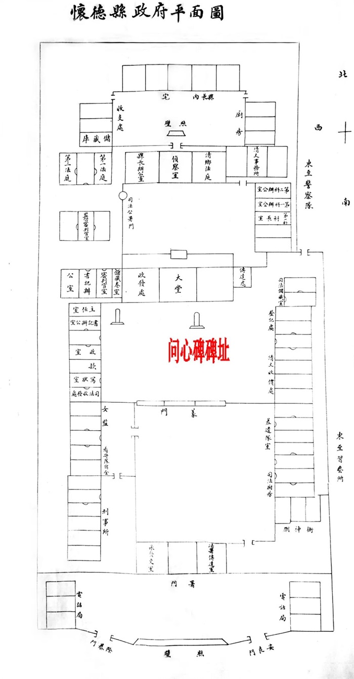 怀德老县衙乃张云祥主持修建,其有两个独特之处传为佳话:一是建县衙门外不立石狮子,二是大堂正门前矗立一通“问心碑”。此后虽改朝换代并经多次修葺改建,但其大门外石狮子始终不立,大堂前 “问心碑”始终矗立。