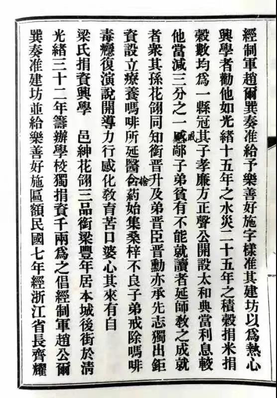 从该段文字可知,县立高等小学堂建设资金,多为社会捐赠。其中赵晋升祖母赵刘氏除独捐白银一仟两,并受到东三省总督赵尔巽给予“乐善好施”字样及准其建坊的褒奖外,还多次捐米捐谷,并且捐数全县第一。想来,这也是众人推举赵晋升领头担责的主要原因吧。