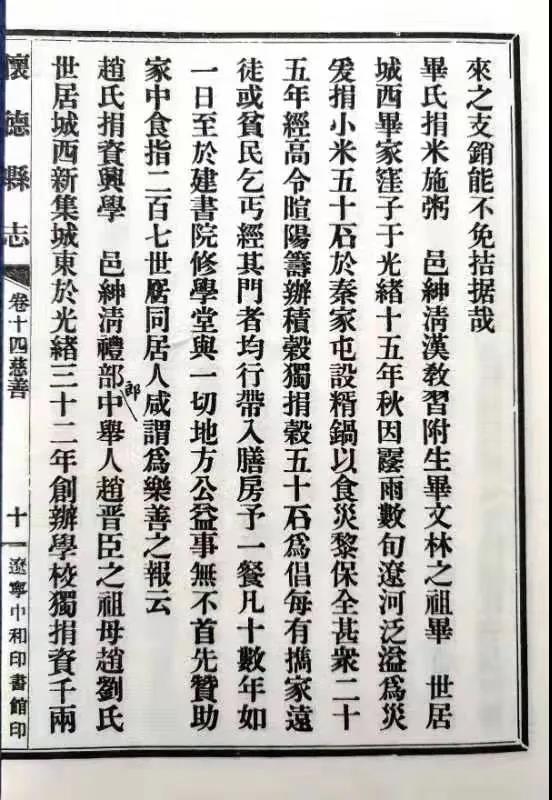 “邑绅清礼部郎中举人赵晋臣之祖母赵刘氏,世居城西新集城东。于光绪三十二年创办学校,独捐资千两。经制军赵尔巽奏准,给予“乐善好施”字样,准其建坊,经为热心兴学者劝。他如光绪十五年之水灾,二十五年之积谷,捐米捐谷数均为一县冠。其子孝廉方正声公,开设太和典当,利息较他当减三分之一。戚党子弟贫有不能就读者,延师教之,成就者众。其孙花翎同知衔晋升及弟晋臣晋勋,亦承先志,独出巨资,设立疗养吗啡所。延医舍药,始集桑梓不良子弟戒除吗啡毒瘾。复演说开导,力行感化教育。苦口婆心,其来有自。”