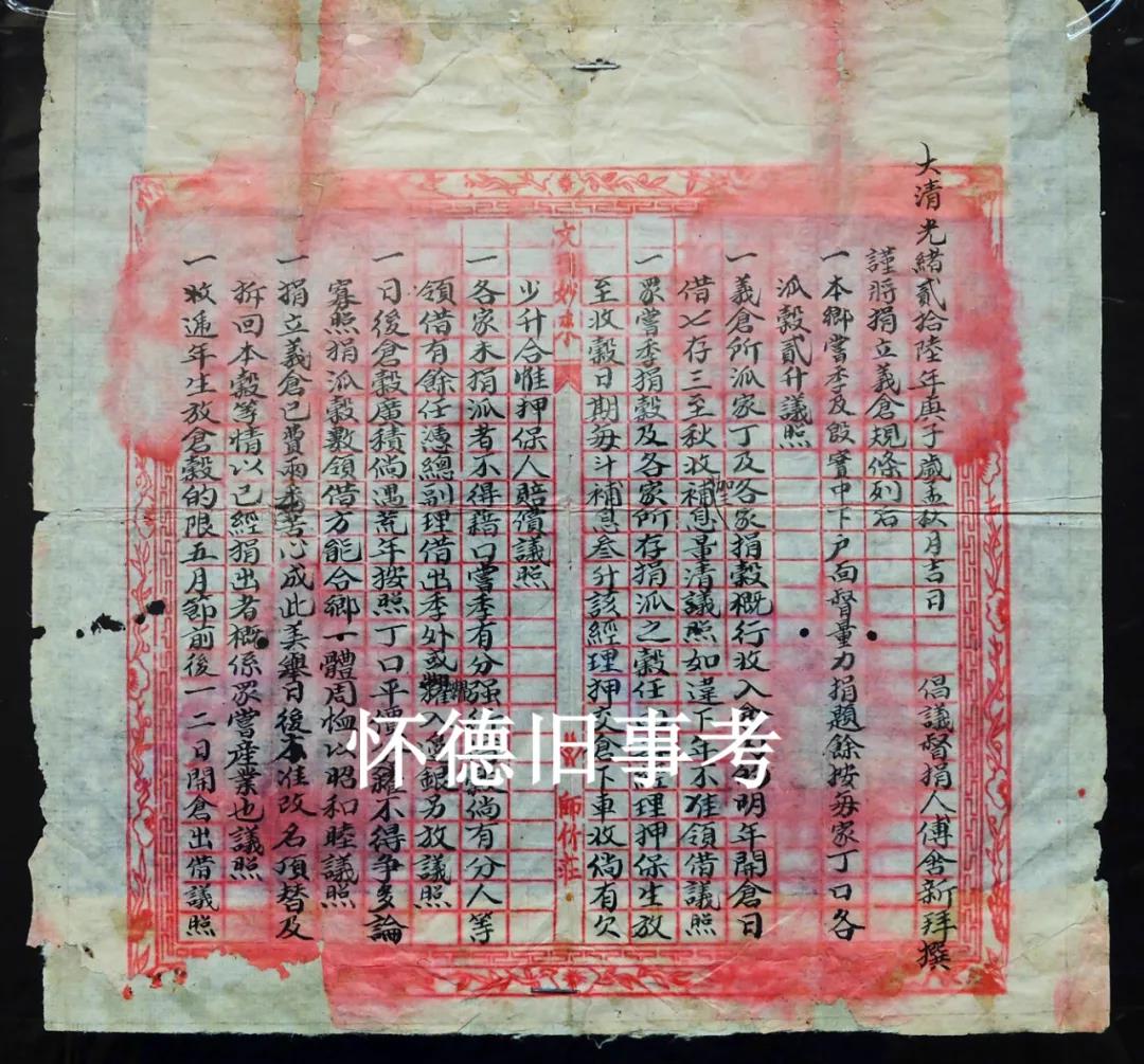 “尝闻圣人之在,尧有九年之水患,汤有年之旱灾。自古至今,人皆念之。倘有不测,乐亦在其中矣!奉尚宪示,谕我州八乡,各捐社谷,共积成众。每年春放秋收,渐积渐多,以备荒欠济需。但我社一理同遵,依捐社谷, 集一会,签派首士,每年生放,云集径收置酒,颇有微存。于今岁置仓一坐,核数不敷,公议冬放春收,夏放秋收。倘借者,宜先知明首事,按丁发放,以免寡少争多。收谷临期,各宜预备交给,无得推延过期。倘有推延,三日一限,重罚。六日为二限,九日为三限。倘三限仍不交给清数,公议禀官调妥。无违特启公议布告,各宜凛遵。倘敢固违,莫未言之先也。